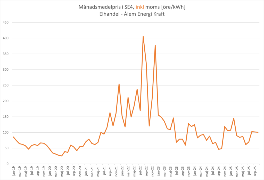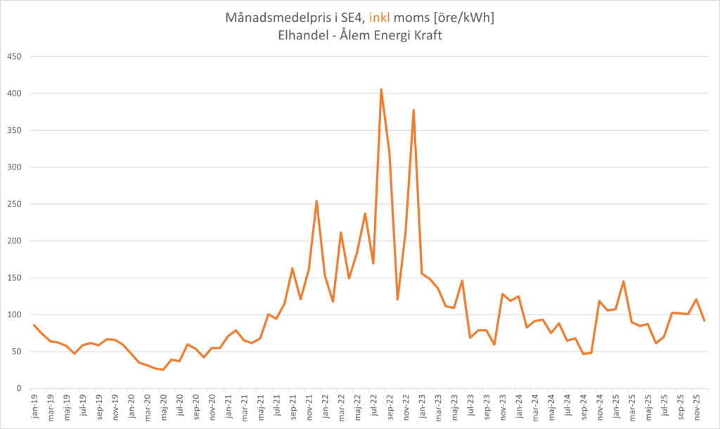 Priserna anges i öre och kostnaden är per kilowattimme.